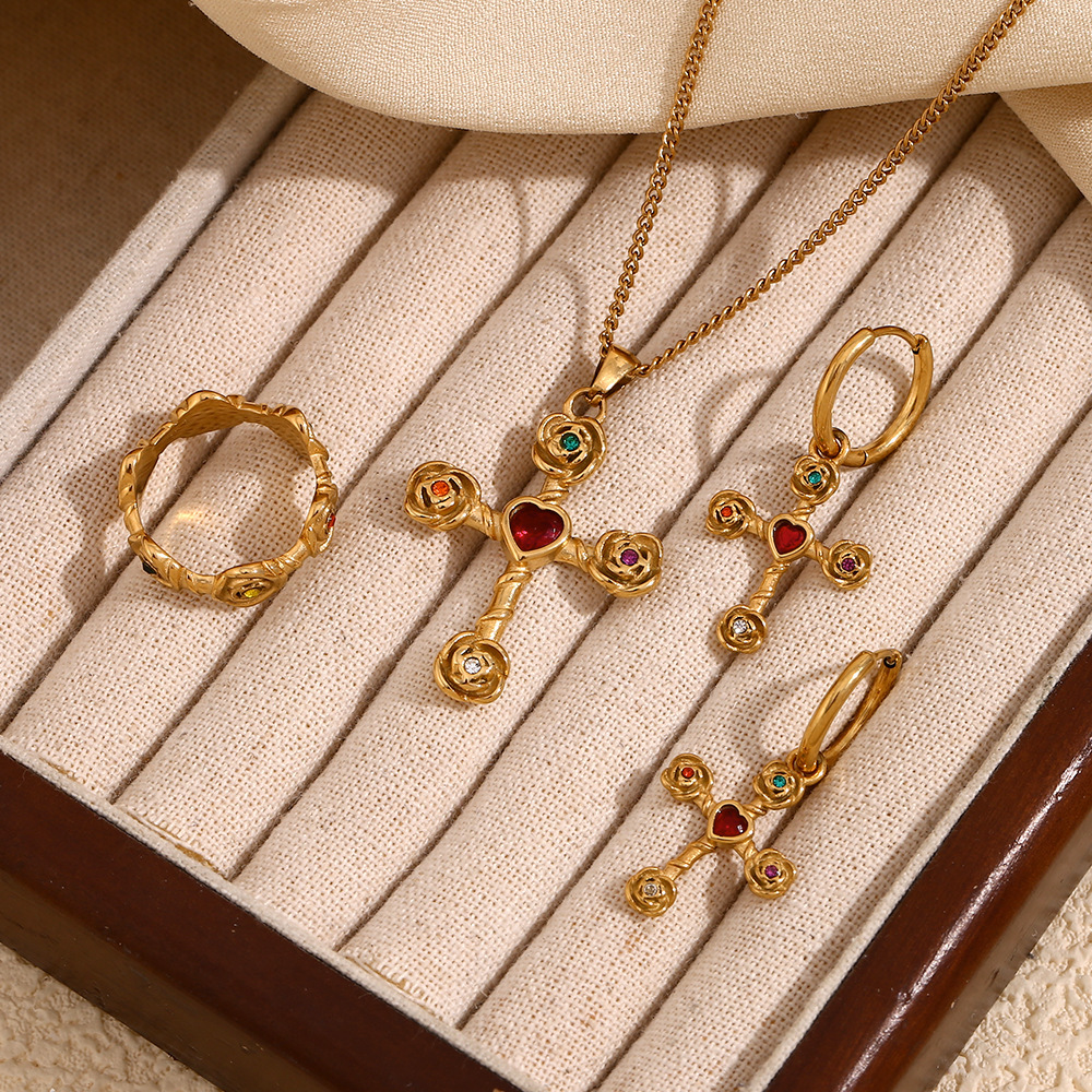 Color: Ross cross pendant earrings-gold, Ross cross pendant 1.8mm curb necklace necklace-gold, colorful Crystal Rose ring-Golden-No. 6, colorful Crystal Rose ring-Golden-No.7, colorful Crystal Rose ring-Golden-No.8